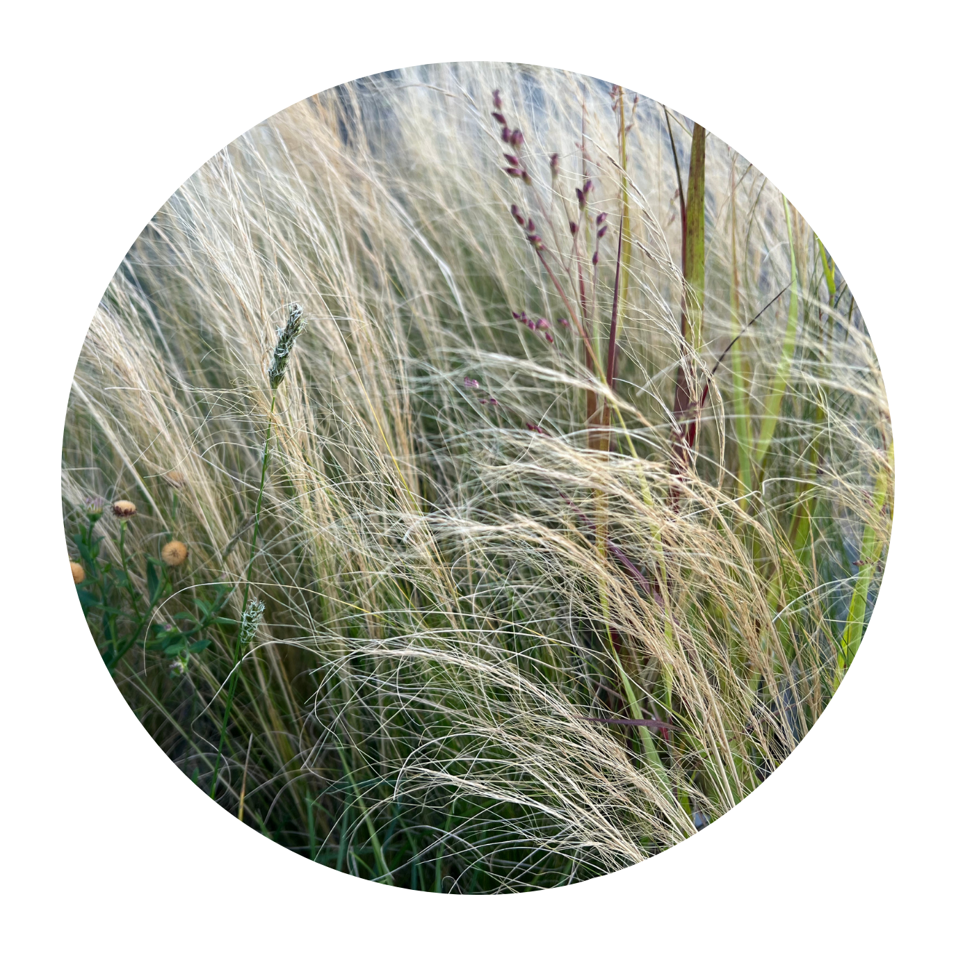 Lys og luftig, plantesammensætning med græsser og stauder. De karaktergivende lette græsser med svejsende aks bølger i vinden og skaber et naturligt og levende udtryk. Enkelte blomster i sommermånederne og aks som fungerende vinterstandere.